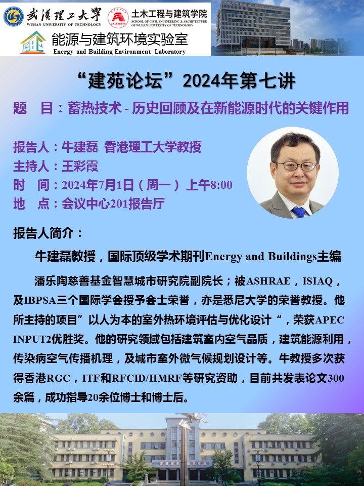 2024年7月1日,香港理工大学牛建磊教授应av影片 建环系副主任王彩霞博士邀请来我校讲学。上午8:00,在西院会议中心201报告厅,牛建磊教授为我校师生做了题为“蓄热技术-历史回顾及在新能源时代的关键应用”的学术报告。学术报告会由av影片 王彩霞老师主持,我校av影片 文远高教授、吴永佳教授、陈琼、严天、周希霖、刘梦阳博士等青年教师以及来自av影片 、材料科学与工程av影片 、信息工程av影片 、化学化工与生命科学av影片 等的百余位研究生和本科生参加了学术报告会。