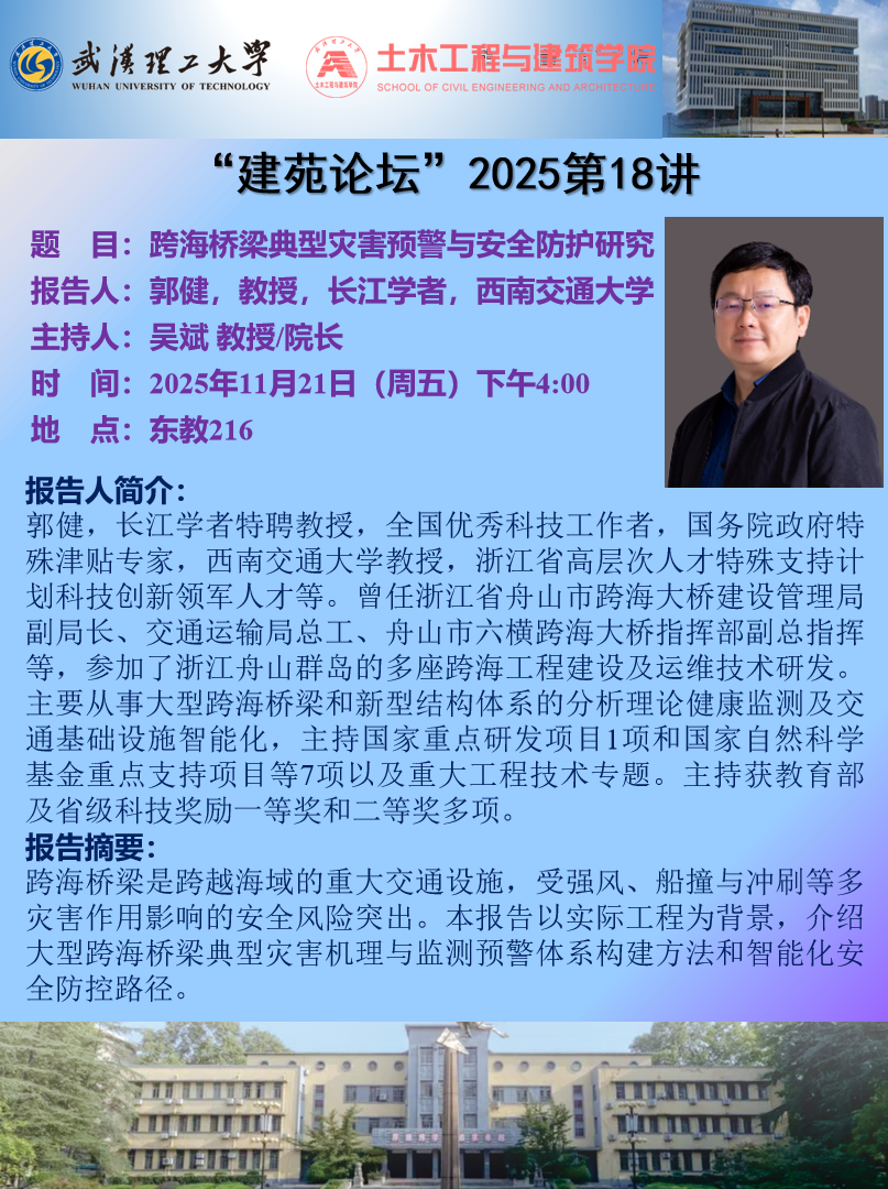 “建苑论坛”2025第18讲 主题:跨海桥梁典型灾害预警与安全防护研究