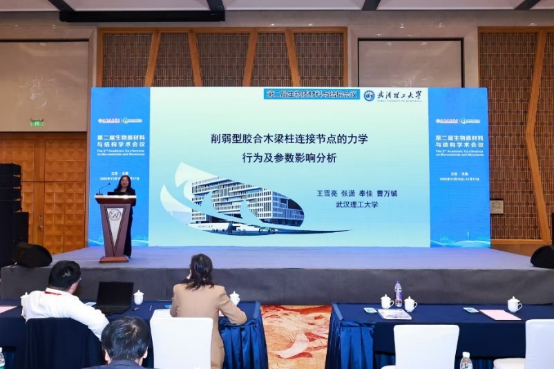 会议通过主旨报告、特邀报告、大会报告等形式,深入探讨了生物质材料与结构的基本理论、加工制备和工程实践等热点问题。av影片土木工程系教师王雪亮进行了题为《削弱型胶合木梁柱连接节点的力学行为及参数影响分析》的学术报告,分享了团队在胶合木框架结构抗震性能方面的最新研究成果,得到与会专家的好评与关注。