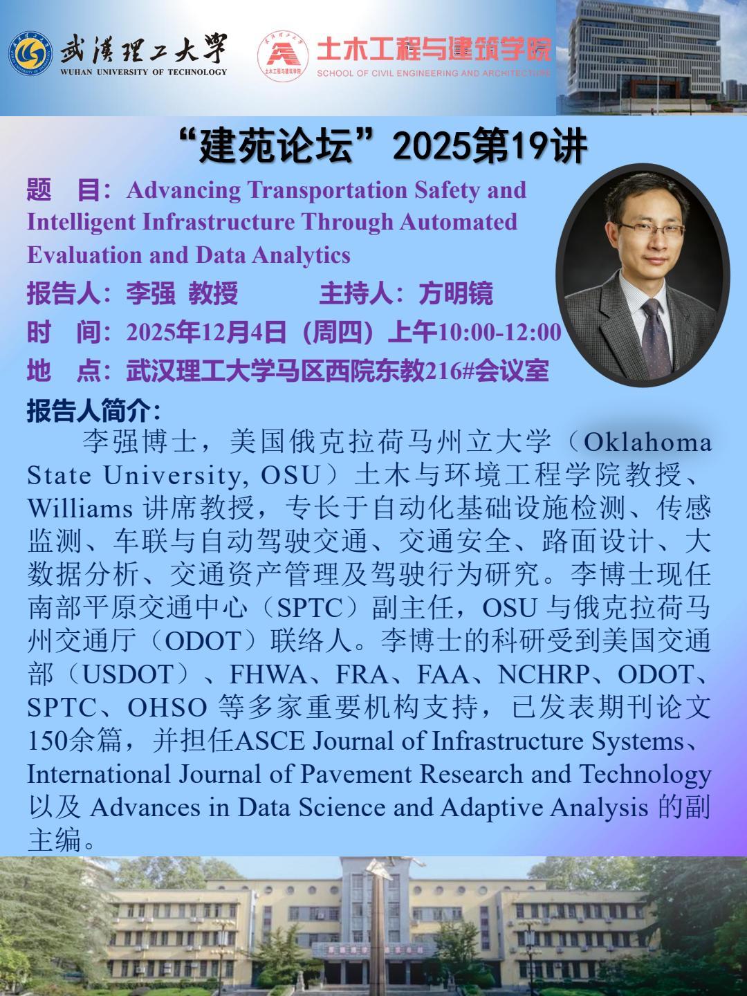“建苑论坛”2025第19讲 主题:Advancing Transportation Safety and Intelligent Infrastructure Through Automated Evaluation and Data Analytics
