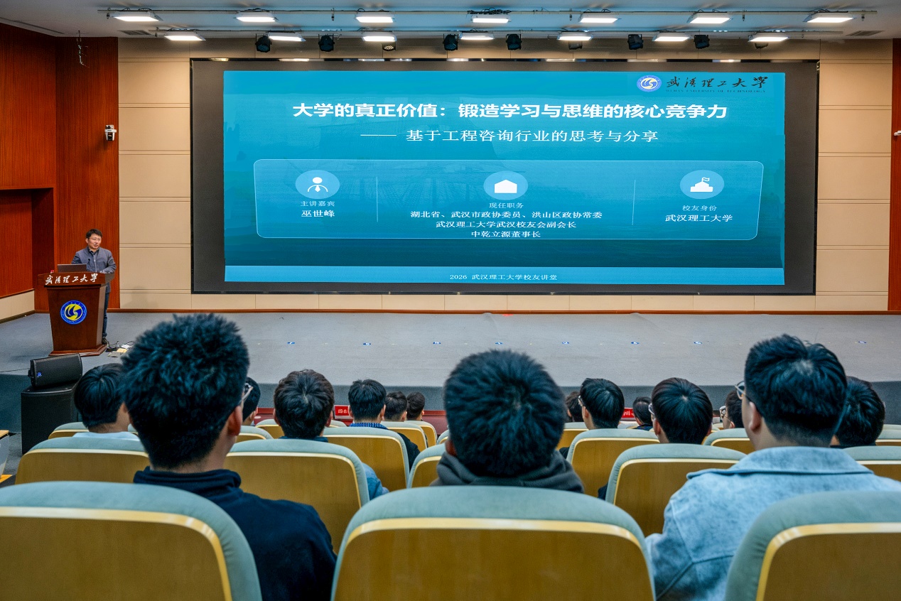 3月26日,中乾立源工程咨询有限公司董事长、湖北省政协委员巫世峰受邀来校,为av影片 2025级本科生作“大学的真正价值:锻造学习与思维的核心竞争力”专题报告。中乾立源总裁梁富运、总经理夏丽波、办公室主任闵芳,av影片 副院长陈伟、党委副书记张巍,及200名2025级本科生参加报告会。报告会由av影片 副院长彭恺主持。