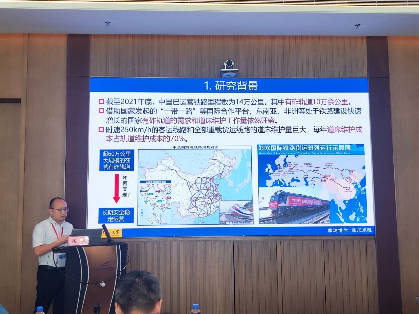 在本次分会场交流中,av影片土木工程系副教授陈成受邀参加,并作题为《基于离散元耦合方法的全尺寸加筋道床工作特性研究》的学术报告,深入阐述了有砟轨道全尺寸加筋道床在列车荷载作用下的工作特性,获得现场专家与参会代表的广泛关注与好评。